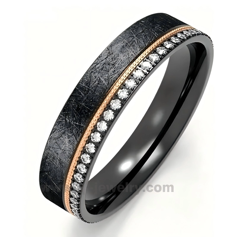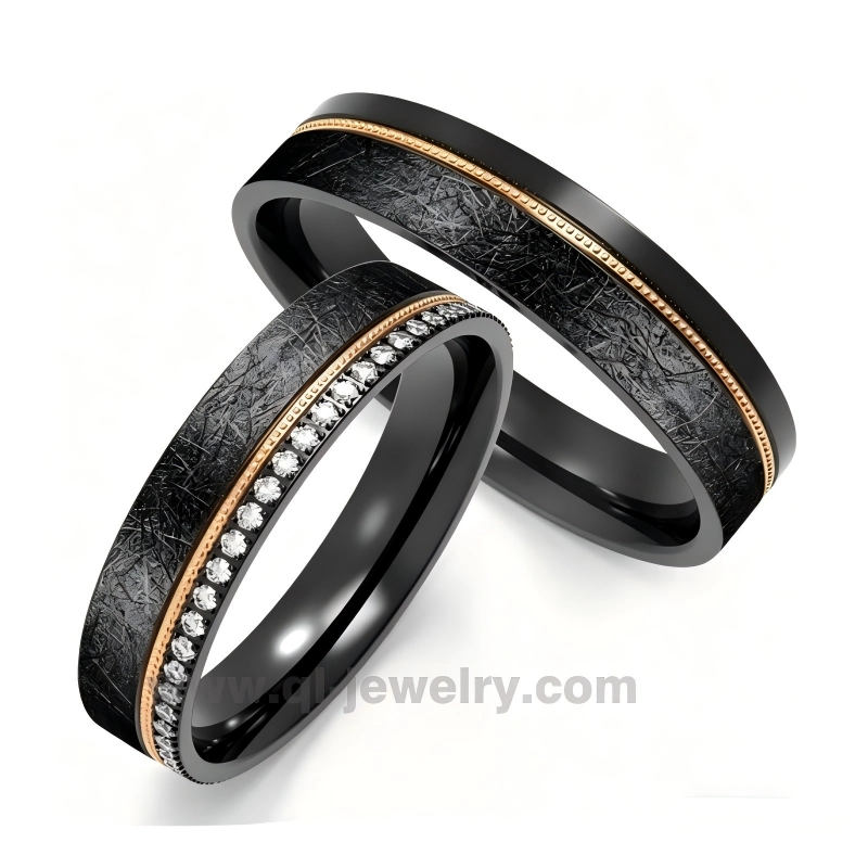 Los anillos de titanio negro están hechos de 51% circonio y 49% titanio. Al igual que el anillo de circonio negro, el color negro del anillo de titanio negro se crea mediante el proceso de calentamiento y no mediante recubrimiento, pero el color es más oscuro y estable que el anillo de circonio negro.