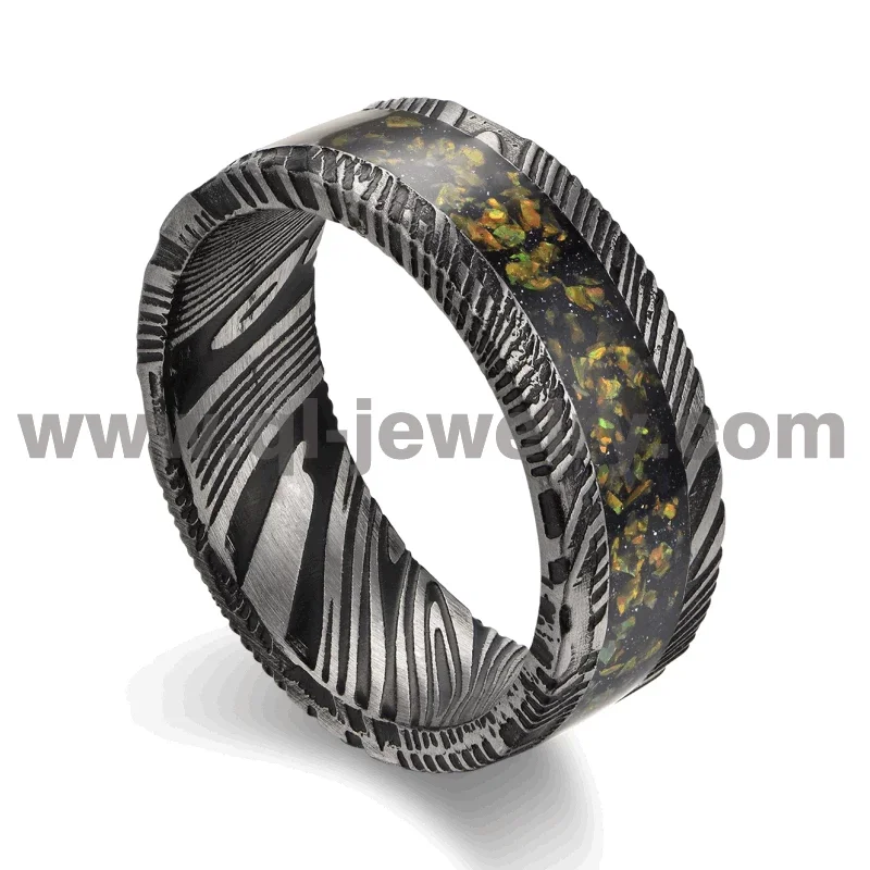 One of the most exciting aspects of choosing a black Damascus steel ring is the variety of inlay options available. Damascus wedding band manufacturers offer an array of materials to complement the dark, patterned steel. Popular choices include vibrant opals, earthy sandstones, and even precious metals like gold or platinum. These inlays not only add a pop of color or texture to the ring but also allow for personalization. Whether you prefer a subtle accent or a bold contrast, the right inlay can transform your custom ring into a truly one-of-a-kind piece that reflects your individual style and personality.