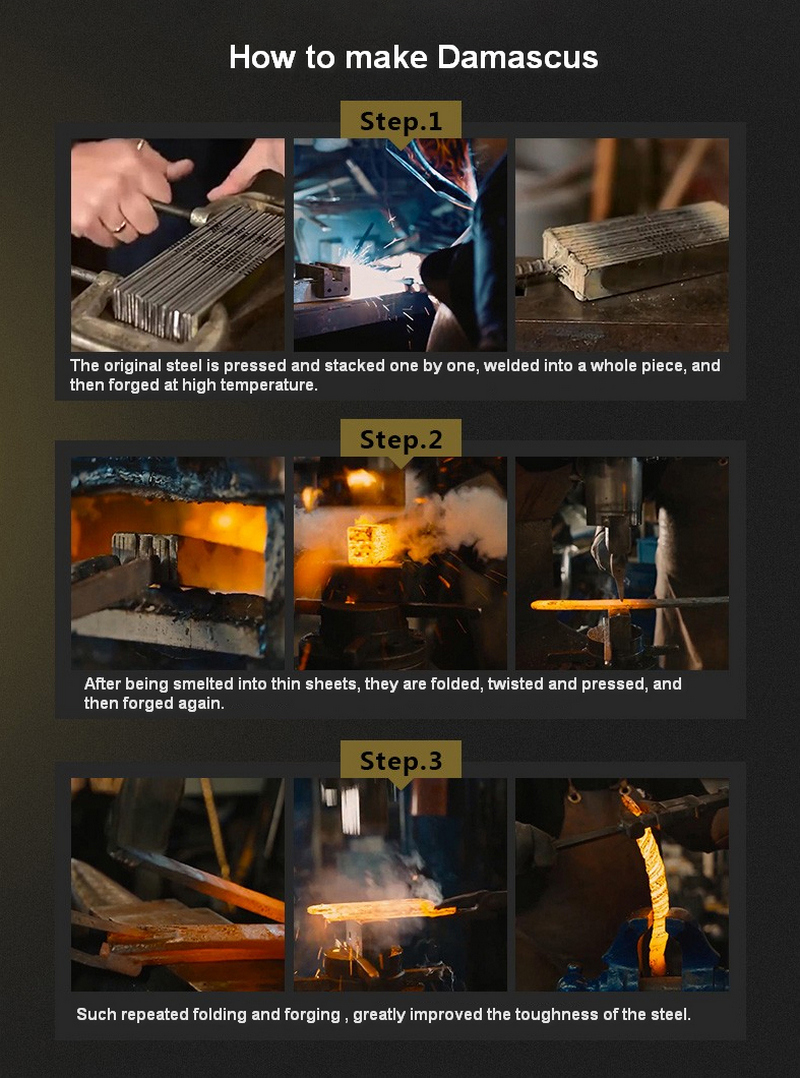 The manufacture of modern Damascus steel greatly saves labor and costs. Forging and welding are used to stack steels with different carbon contents for heating, folding and forging until they are integrated, so it is also called pattern welded steel. Damascus steel made by folding and forging technology has more obvious pattern characteristics. This kind of pattern may be hidden or visible, and some of it can be revealed during forging, but under normal circumstances, it must be corroded by acid to appear.