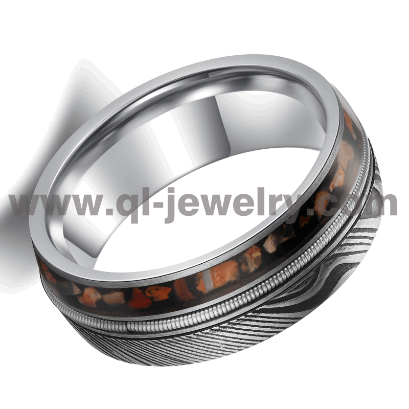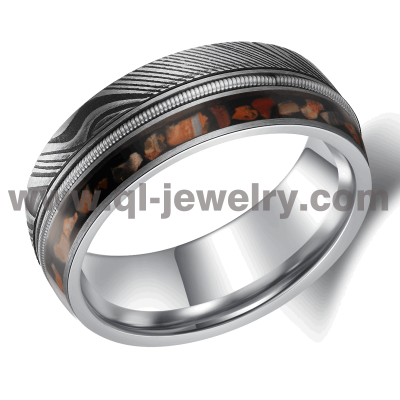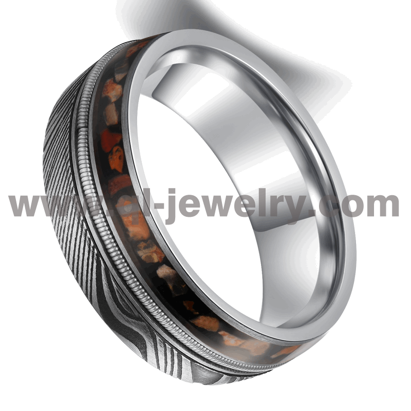 Affordable and Unique Damascus Steel Wedding Bands Damascus Steel and Tungsten Ring with Dinosaur bone and Guitar String Inlay China Manufacturer