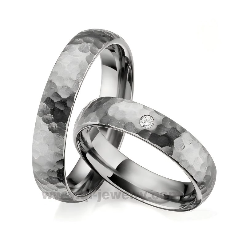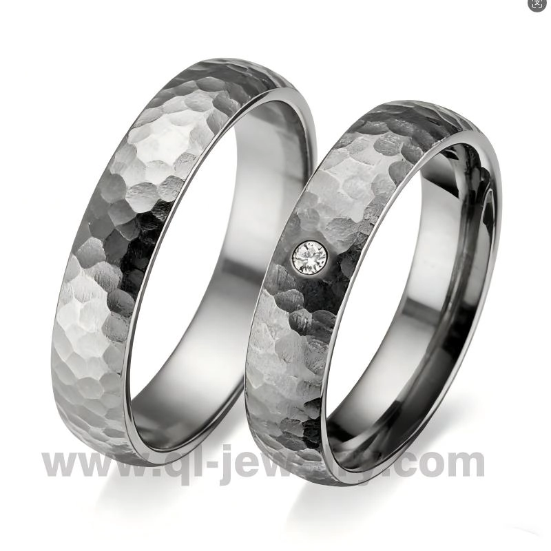 Handcrafted hammered tantalum couple rings with diamond accent. Premium hypoallergenic tantalum offers corrosion resistance and durability. His minimalist band features a clean hammered finish; her ring showcases a diagonal row of sparkling diamonds. Brushed outer surface with polished inner band for all-day comfort. Custom sizes, engraving, and diamond upgrades available. Ideal for wedding bands, anniversary gifts, or everyday wear. Wholesale & OEM welcome.