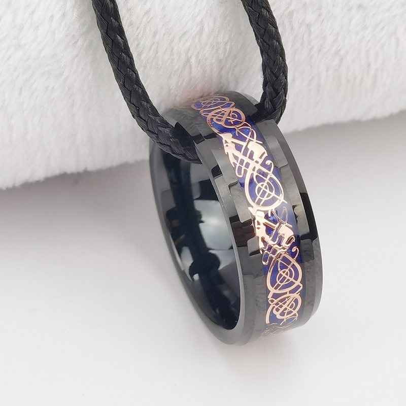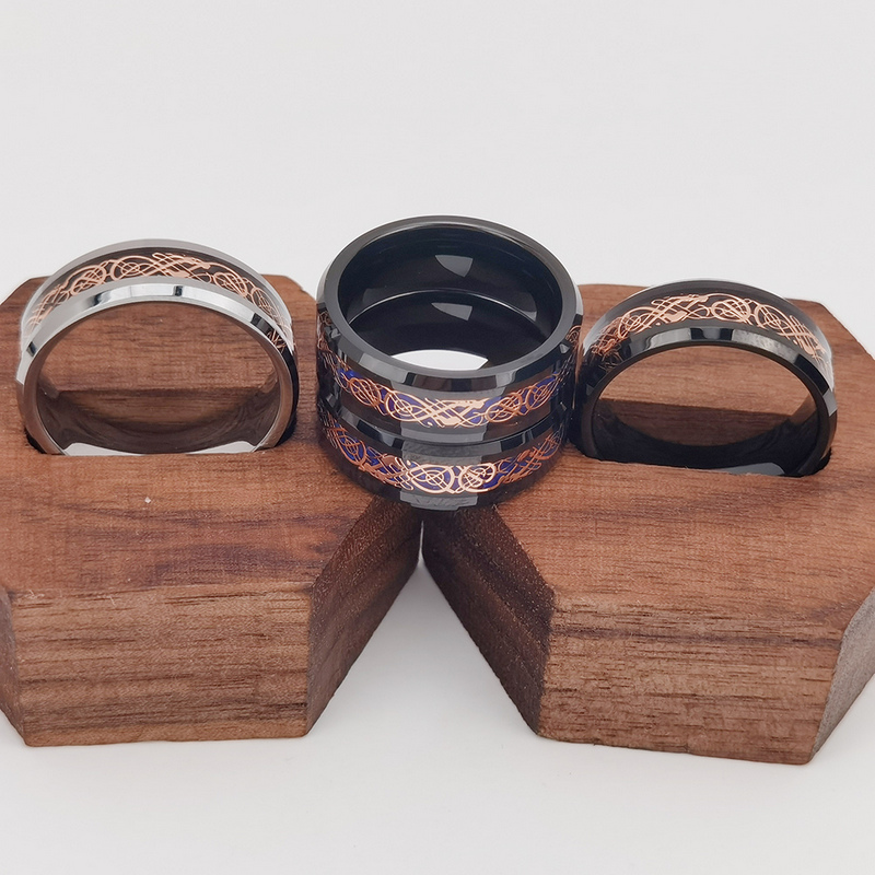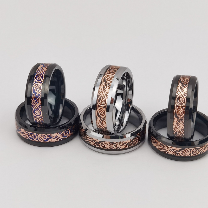 Tungsten Ring in Stock 8mm High polished Flat and Beveled Edges Black Tungsten Carbide Ring Inlay with Rose Gold Dragon and Blue Background China Manufacturer