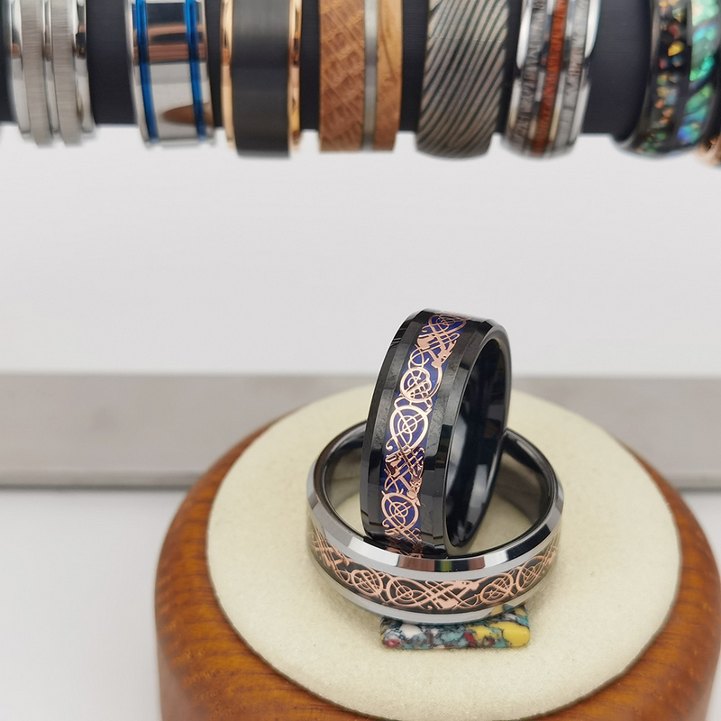 We can inlay different materials on tungsten rings, such as tungsten carbide ring with carbon fiber inlay, tungsten carbide ring with dragon steel inlay, tungsten carbide ring with resin inlay, tungsten carbide ring with meteorite inlay, tungsten carbide ring with antler inlay, tungsten carbide ring with wood, tungsten carbide ring with opal, tungsten carbide ring with shell, tungsten carbide ring with turquoise inlay, tungsten carbide ring with chip inlay, tungsten carbide ring with gear wheel inlay etc.