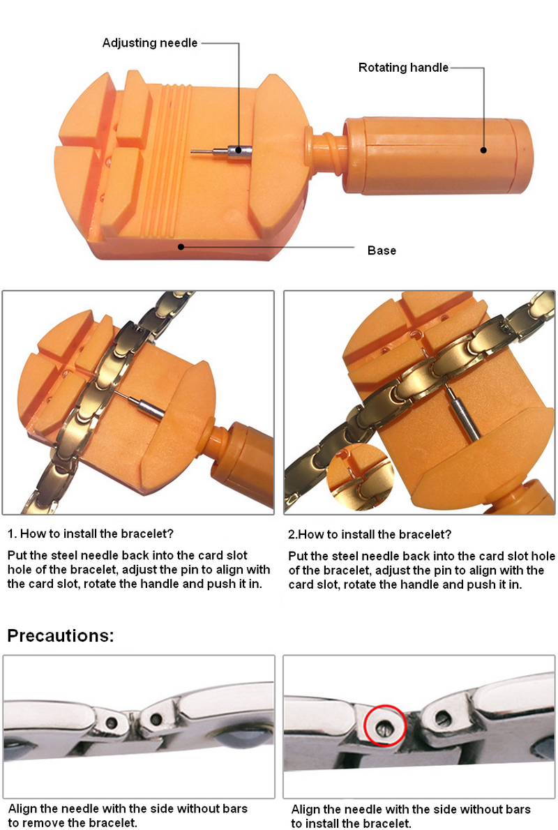 The length of the bracelet can be adjusted, as shown in the figure below, it can be easily unloaded and adjusted with a needle or adjuster.
